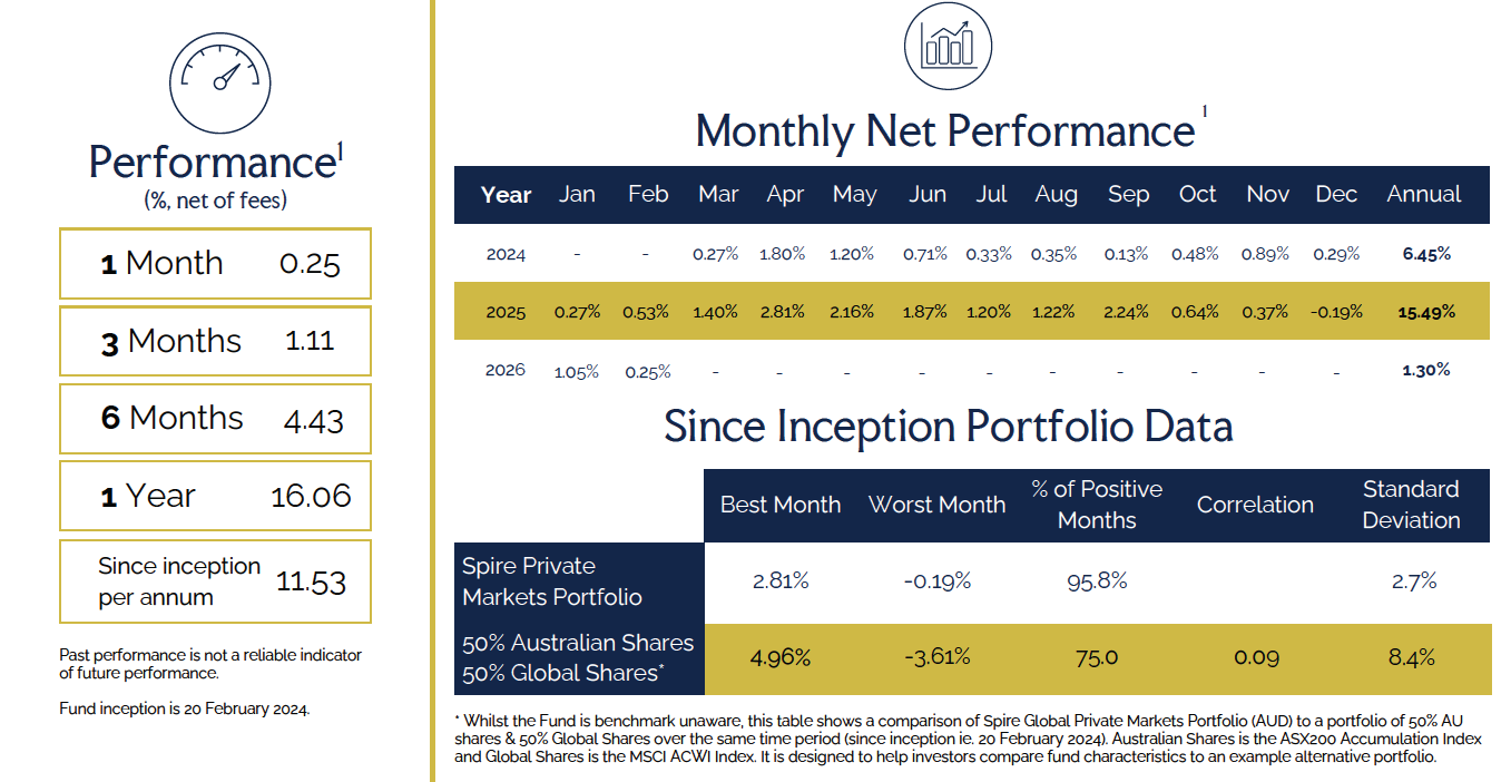 The Spire Global Private Markets Portfolio (Fund) seeks to return a net 10-13% per annum over rolling 7 year periods. The Fund is a multi-asset portfolio which provides exposure to private market investments, across private equity, private debt, private infrastructure and private real estate sectors. An allocation to cash and other tradable assets provides liquidity to efficiently trade, manage cash flows and fund new investments.