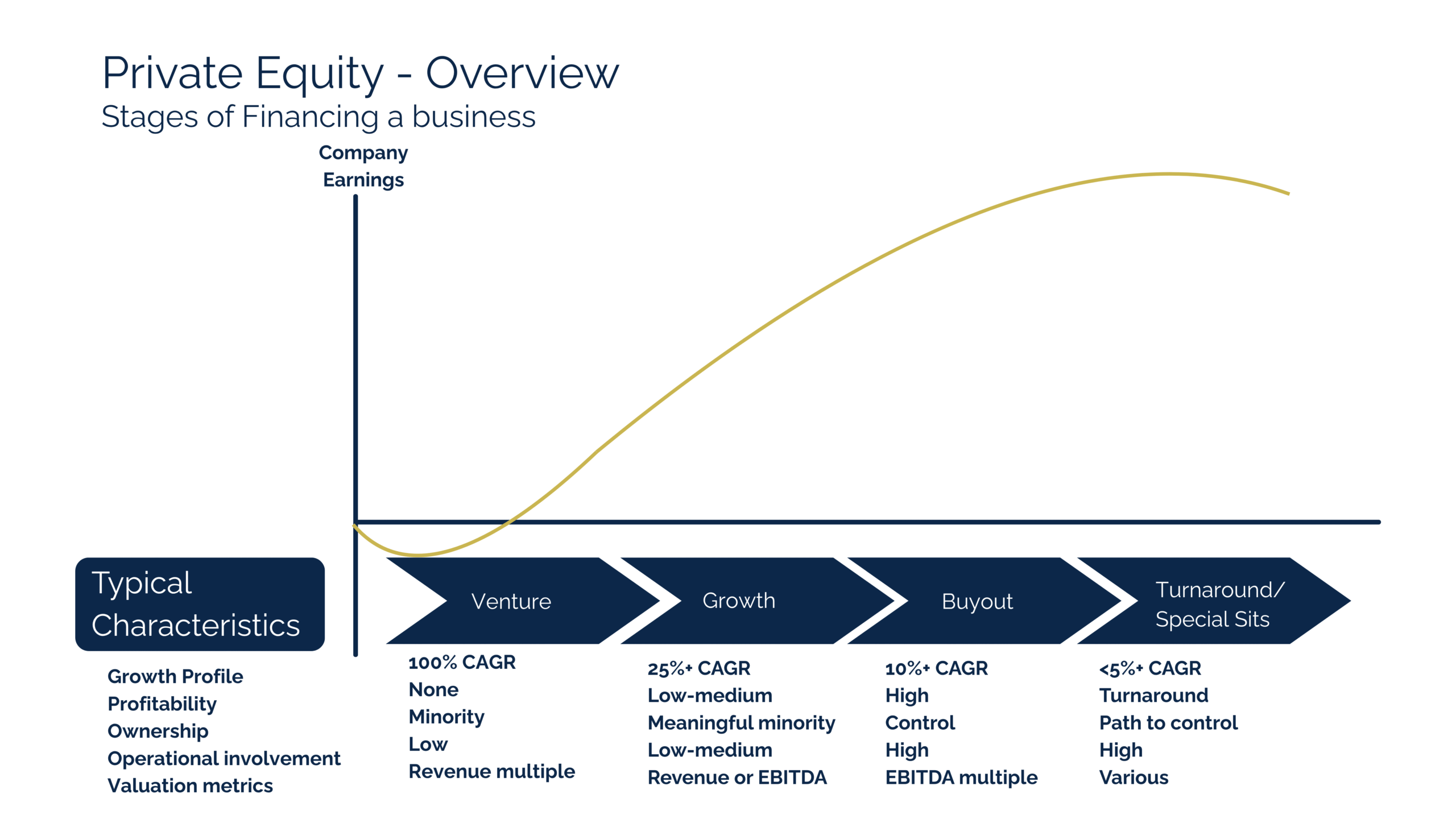 PE as a sub-asset class of private markets spans venture capital (backing startups), growth equity (accelerating expansion-stage companies), buyouts (enhancing established businesses) and turnarounds/special situations (rescuing or repairing bad balance sheets or companies not operating at full potential).